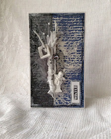 У меня сложился блокнот. Обложка из льняной ткани, Белый эмбоссинг через маску от Тима Хольца, брызгала спреями от Ranger - черным и синим, оттиск тестовым штампом белой акриловой краской, перья, кружево ручной работы, покупное кружево, бусинки на леске, гипсовая фигурка ангелок.