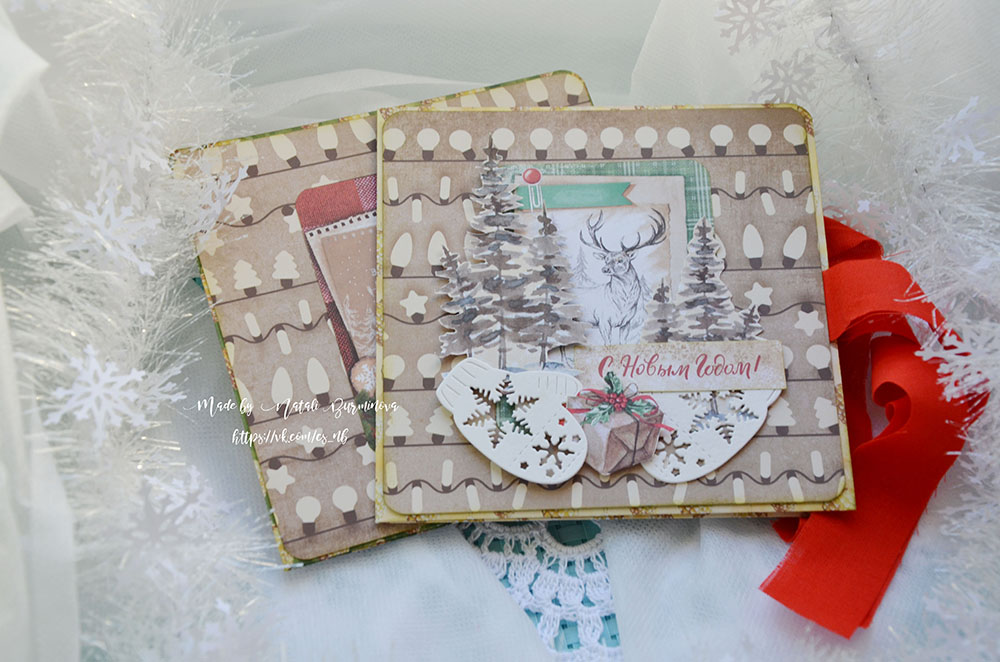 вырубка. Обе открытки завязываются на красную хлопковую ленту.