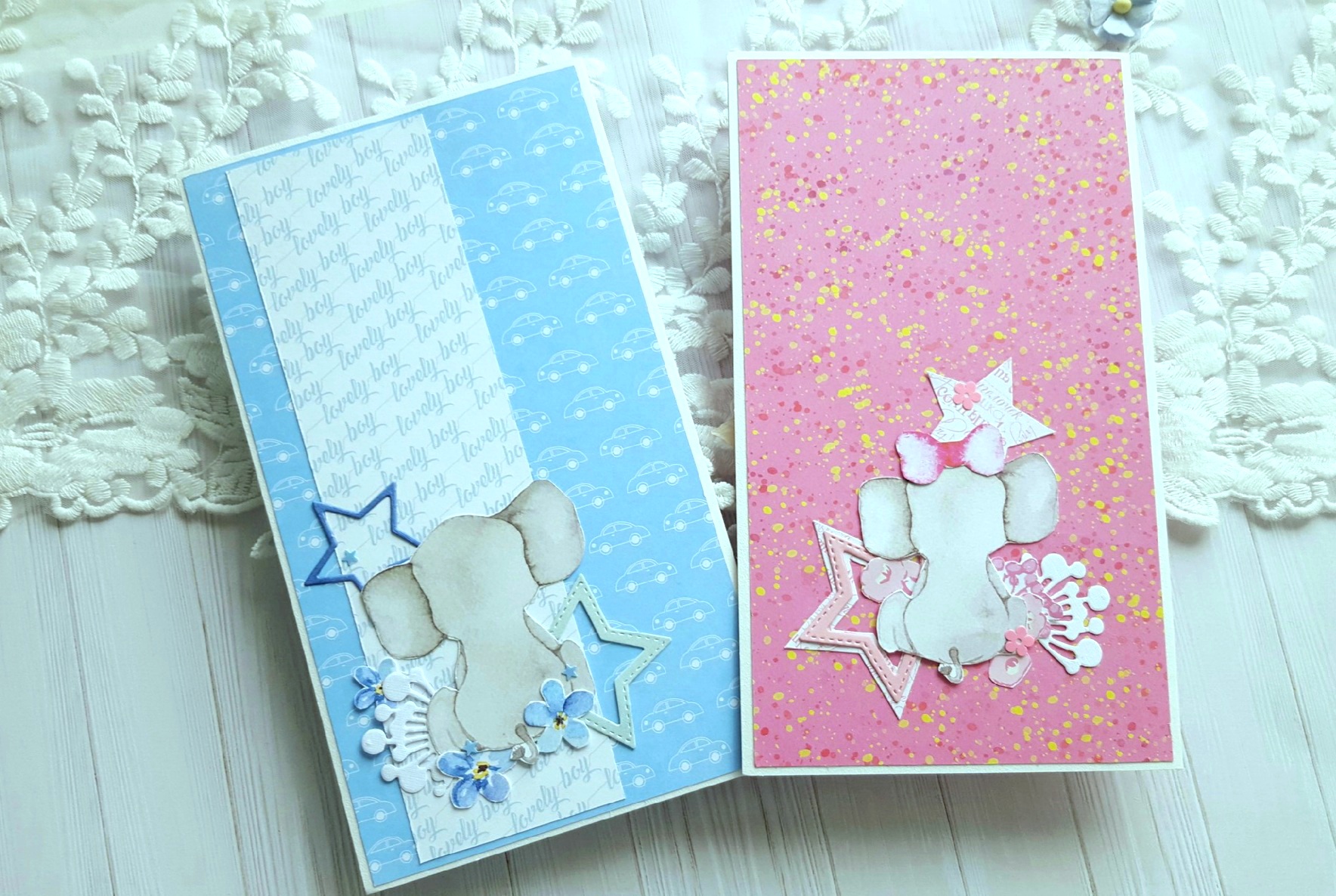 Всем привет! У меня снова детские открытки. На этот раз со слонятами. Слоненок с ярко-розовым бантиком, конечно же, для девочки, а серьезный слон с бабочкой - для мальчишки. На открытках "много букв" на фоне: и русских, и английских. Спрятались буквы и на спинках, которые тоже украшены слонятами.
