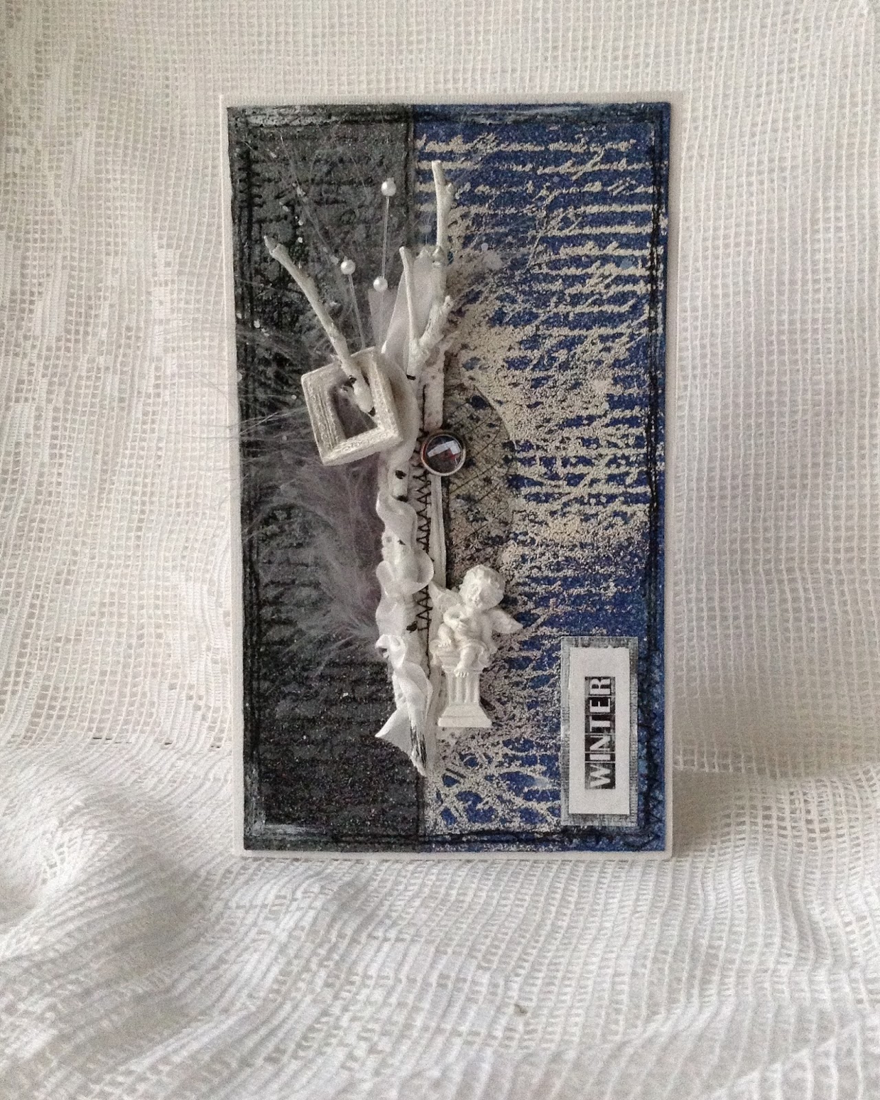 материалы: кардсток, фоновый штамп, дистрессы, горячий эмбоссинг,