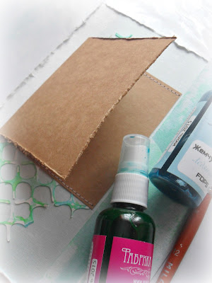 и вырезанные элементы. Так же у меня присутствует бумажный скотч и штампы с растениями. Край слева будет загибаться, формируя кармашек.